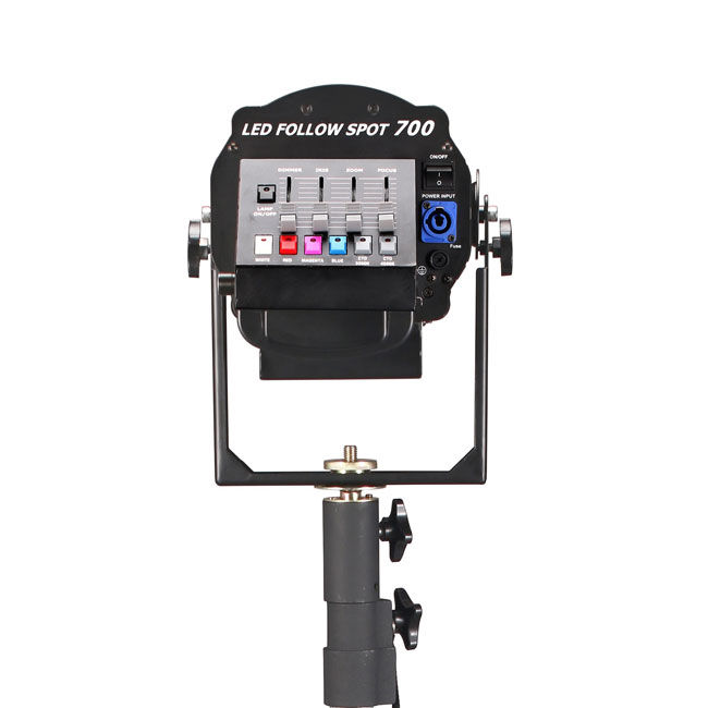 + Control panel by manual equipped on the rear: 4 sliding faders for dimmer, iris, zoom,focus. 7 press buttons for blackout, open, red, magenta, blue, CTO1, CTO2.